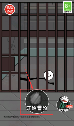 4、點(diǎn)擊開始冒險(xiǎn)按鈕,進(jìn)入火柴人逃脫游戲。