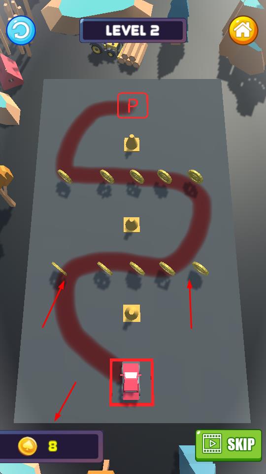 3、留意上方關(guān)卡和金幣數(shù)量,根據(jù)場景變化合理規(guī)劃行駛路線,努力將汽車停入指定的停車位,完成關(guān)卡挑戰(zhàn)。