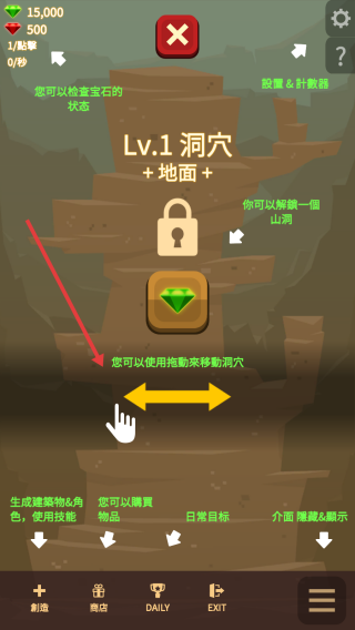 2、進入后可通過拖拽來移動洞穴,以此查看不同區(qū)域,同時還能查看寶石的狀態(tài),了解挖掘情況。