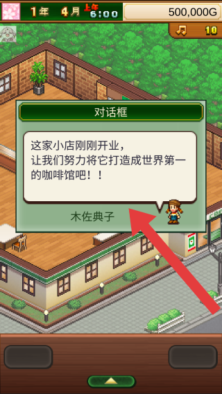 2、顯示時(shí)間為1年4月上午6點(diǎn),玩家擁有資金500,000G,有10點(diǎn)音樂(lè)值,對(duì)話框中角色木佐典子表示小店剛開(kāi)業(yè),要努力將其打造成世界第一的咖啡館。