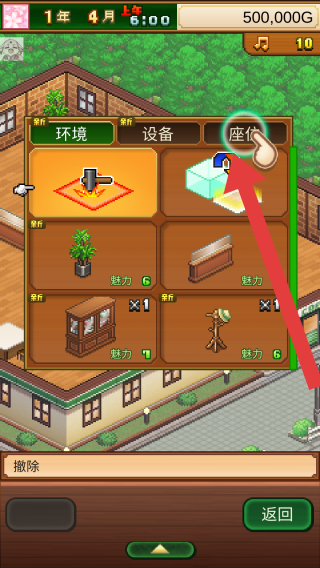 3、畫(huà)面中是店鋪布置界面,可選擇環(huán)境、設(shè)備、座位相關(guān)設(shè)施布置咖啡館,其中部分設(shè)施標(biāo)注了魅力值。