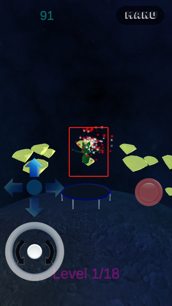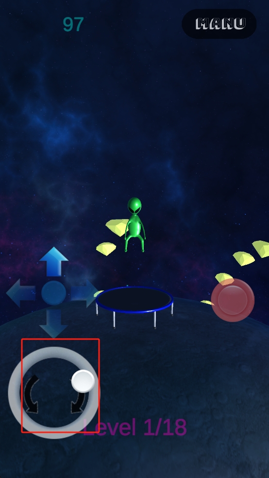 1、操控左下角環(huán)形按鍵旋轉(zhuǎn)外星人朝向,配合中間方向鍵調(diào)整位置,使外星人落至蹦床,同時(shí)瞄準(zhǔn)周?chē)S色晶體,準(zhǔn)備收集。