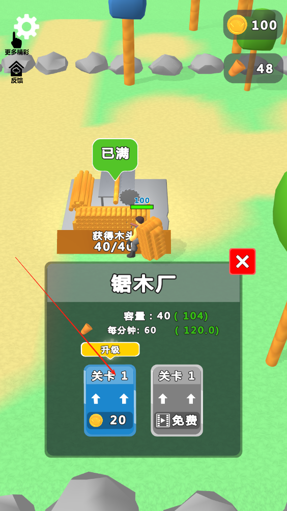 3、木頭賣了錢可以升級(jí)鋸木廠,這樣速度越快,容量越多,獲得的金幣也越多,后續(xù)還可以建造更多工廠,擴(kuò)大基地。