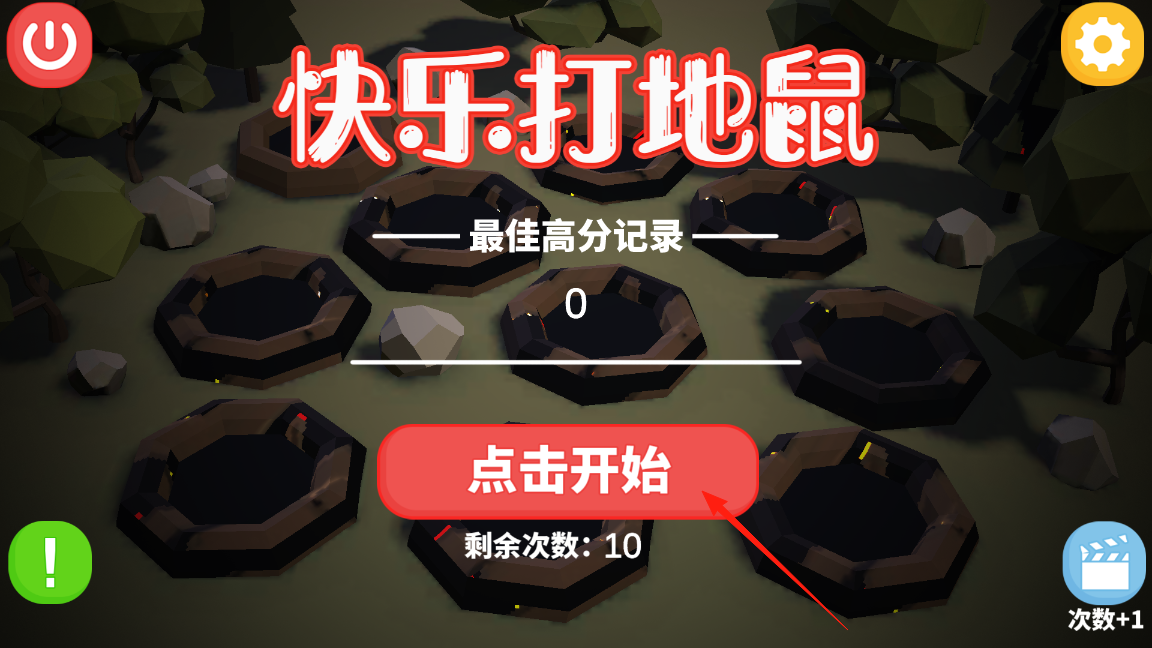 1、點(diǎn)擊點(diǎn)擊開始按鈕,啟動(dòng)快樂打地鼠游戲,界面顯示剩余次數(shù)為10,玩家需在后續(xù)環(huán)節(jié),通過操作擊打地鼠,積累分?jǐn)?shù),借助按鈕觸發(fā)游戲進(jìn)程,開啟打地鼠挑戰(zhàn)。