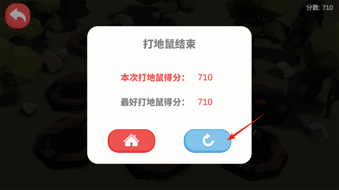 3、彈出結(jié)算界面,顯示本次得分與歷史最佳得分,若想重新挑戰(zhàn),點(diǎn)擊藍(lán)色重新開始按鈕,可再次進(jìn)入游戲,繼續(xù)擊打地鼠,刷新分?jǐn)?shù)記錄,點(diǎn)擊紅色主頁按鈕,可返回游戲界面。
