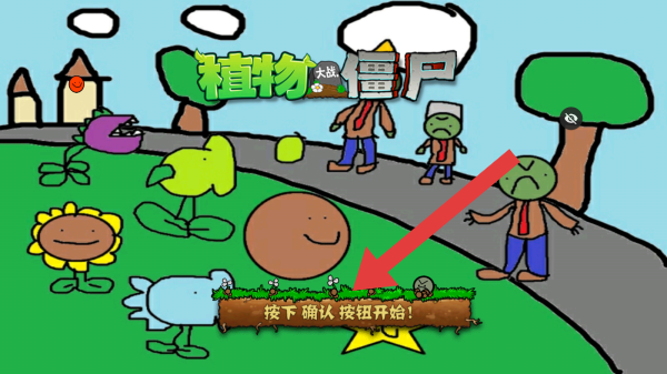 1、畫面呈現(xiàn)出經(jīng)典的植物僵尸元素,根據(jù)按下確認按鈕開始!的交互提示,點擊后方可進入場景。