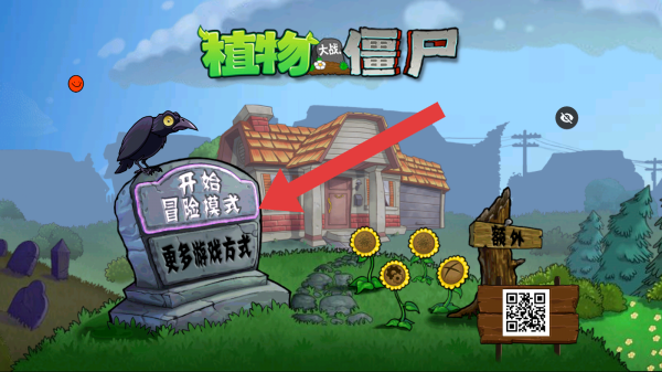 2、界面上有開始冒險模式、更多游戲方式、額外等選項,還有房屋、向日葵、烏鴉、墓碑等場景元素。