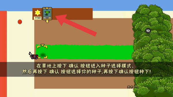 3、畫面中有陽光數(shù)量顯示、植物卡片消耗300陽光,下方文字提示在草地上按確認按鈕進入種子選擇模式,再按確認按鈕選種子并種下,顯示當前關(guān)卡為第1關(guān)。