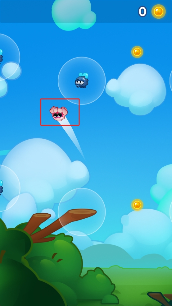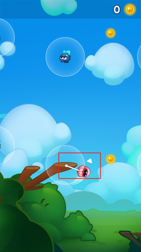 1、開(kāi)局我們點(diǎn)擊紅框內(nèi)粉色角色,觸發(fā)彈射,借樹(shù)枝彈力升空,瞄準(zhǔn)金幣與藍(lán)色角色氣泡。