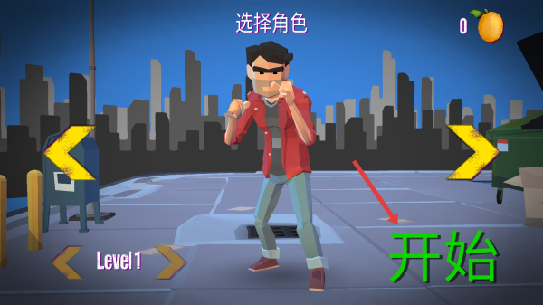1、在角色選擇界面,確認(rèn)角色后點擊開始,進(jìn)入Level1街頭戰(zhàn)斗場景。