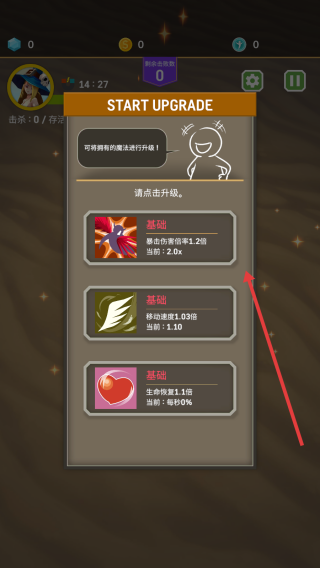 2、在START UPGRADE界面,可對(duì)角色的暴擊、移動(dòng)速度、生命恢復(fù)等屬性進(jìn)行升級(jí),提升角色戰(zhàn)斗力。