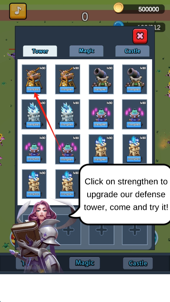 2、進(jìn)入防御塔升級(jí)界面,跟隨提示,點(diǎn)擊strengthen,升級(jí)防御塔,增強(qiáng)防御能力,點(diǎn)擊購(gòu)買(mǎi)。