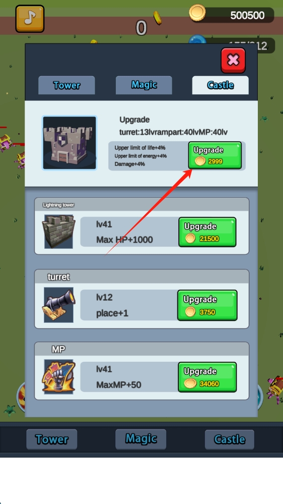 3、在城堡升級(jí)界面,點(diǎn)擊Upgrade,升級(jí)城堡,增加生命值、能量上限和傷害,點(diǎn)擊升級(jí)。