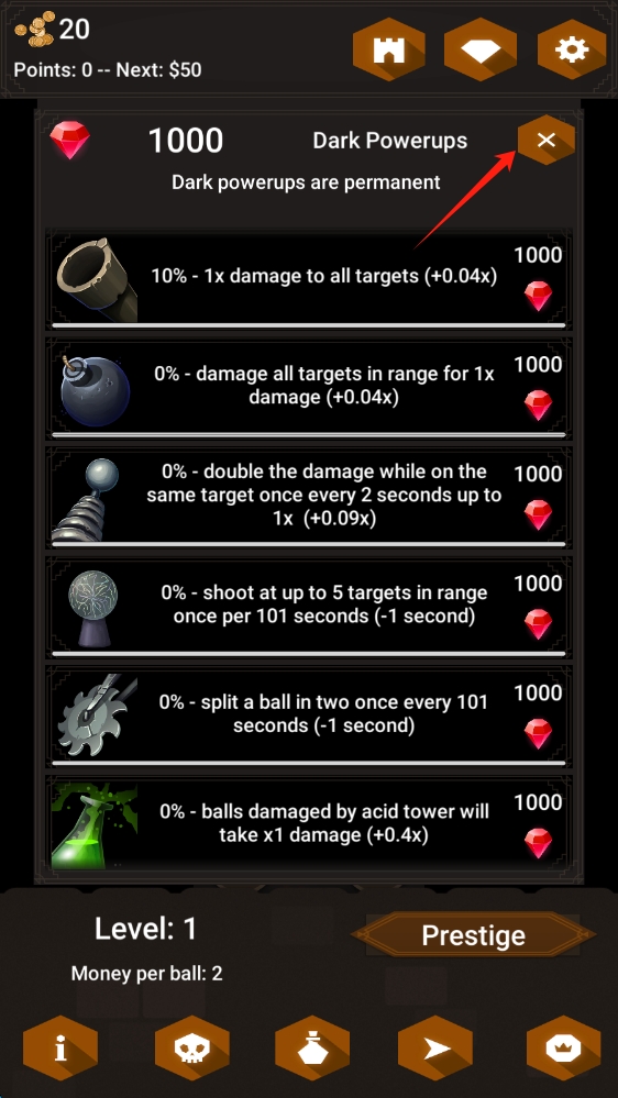3、在Dark-Powerups界面,點(diǎn)擊×,關(guān)閉該界面,根據(jù)游戲需求,合理利用游戲內(nèi)道具和功能,點(diǎn)擊查看。