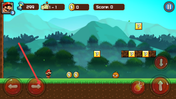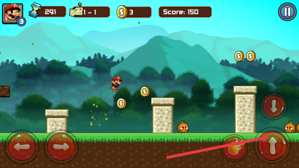 1、在進(jìn)入游戲后,通過(guò)左下角的左右箭頭按鈕控制角色移動(dòng),在關(guān)卡場(chǎng)景中冒險(xiǎn),注意收集金幣以及踩踏敵人。