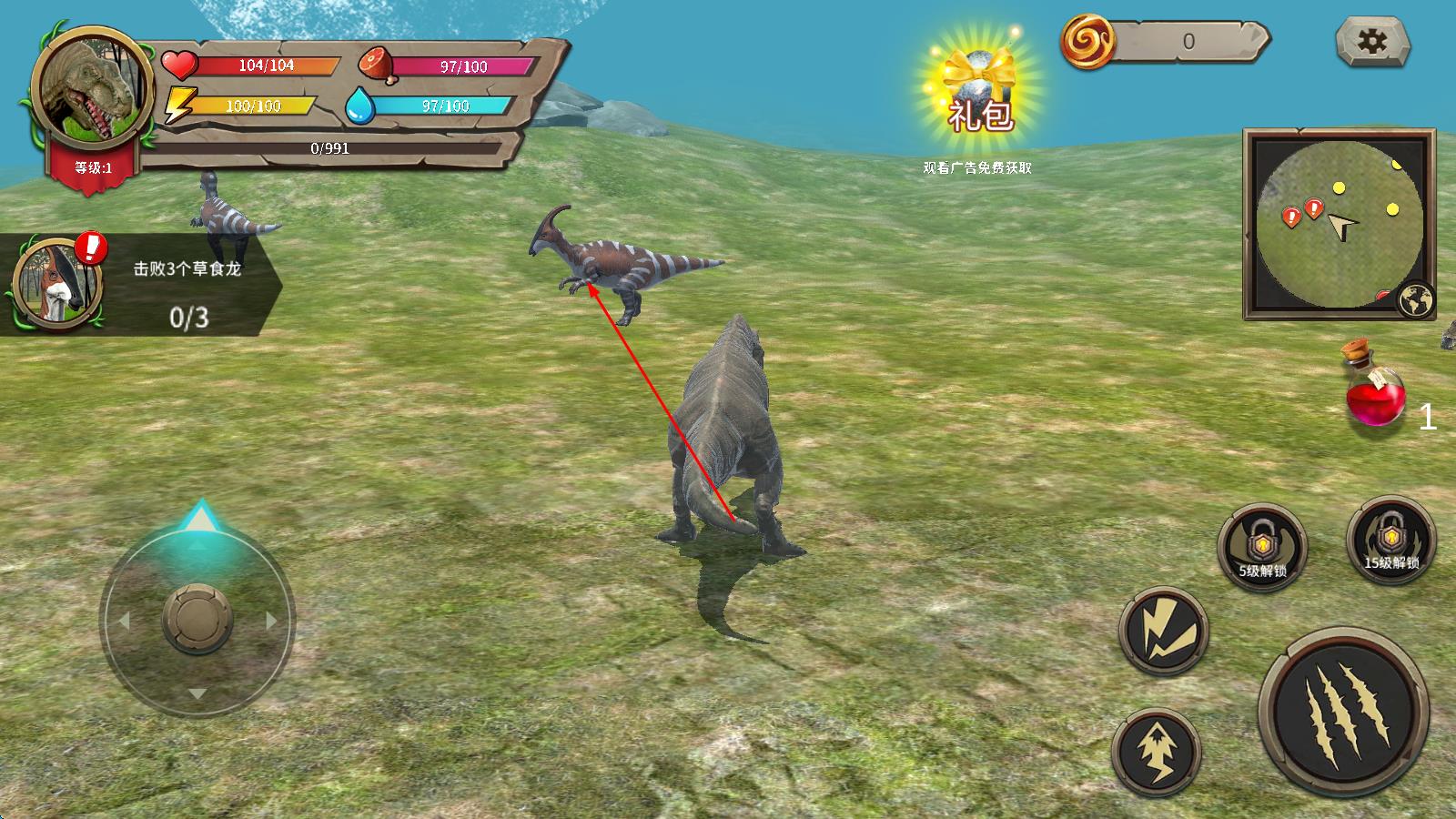 1、進(jìn)入游戲后,從霸王龍、劍龍等多種恐龍中選擇初始種類(lèi),在雨林場(chǎng)景中熟悉左下方輪盤(pán)控制移動(dòng)、右側(cè)滑動(dòng)調(diào)整視角的基礎(chǔ)操作,尋找小型生物練習(xí)吞噬。