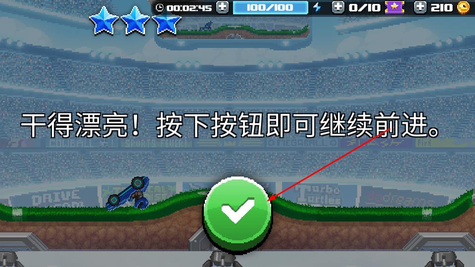 3、成功通過賽道后,點擊綠色對勾按鈕,完成結算,可繼續(xù)推進游戲,就能開啟新競速關卡挑戰(zhàn)更多復雜賽道。