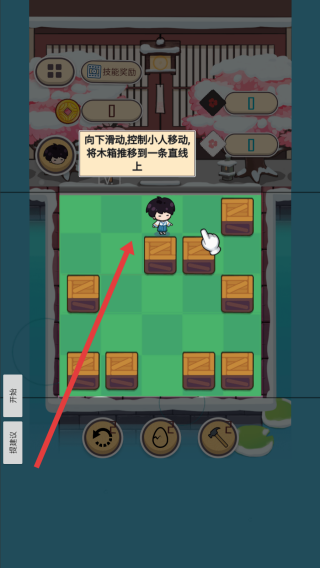 2、進(jìn)入關(guān)卡后,需要根據(jù)提示向下滑動控制小人移動,按提示將木箱推成一條直線,規(guī)劃好移動路徑。