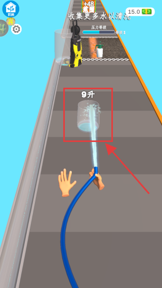 2、在游戲場景中,操控水管收集紅色方框內(nèi)標(biāo)有9升的水桶,獲取相應(yīng)的水量,滿足游戲任務(wù)需求。