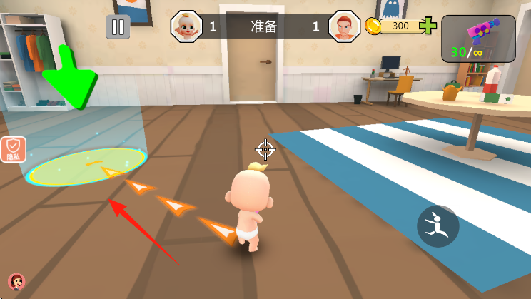 1、進(jìn)入游戲準(zhǔn)備階段,跟隨箭頭與綠色指引,讓嬰兒角色移動到指定區(qū)域,完成戰(zhàn)前準(zhǔn)備。