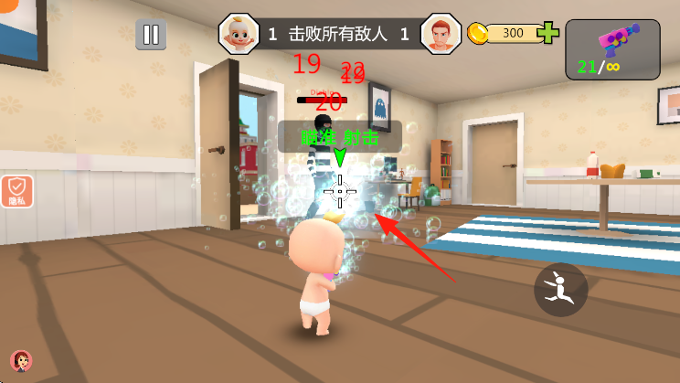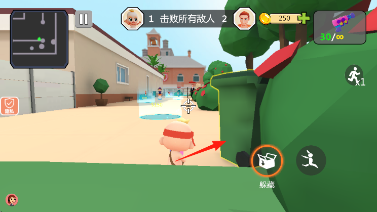 3、戶外場景中,按箭頭提示,操控嬰兒靠近掩體,可點(diǎn)擊躲藏規(guī)避敵人,再伺機(jī)攻擊,完成關(guān)卡任務(wù)。