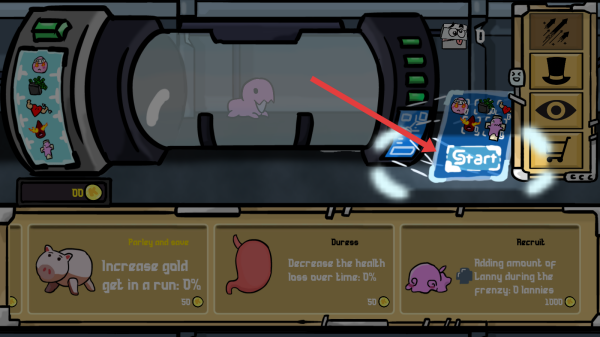 2、在飛船場景中,通過點擊Start按鈕,選定增益效果后,讓粉色角色Lanny開始逃亡挑戰(zhàn)。
