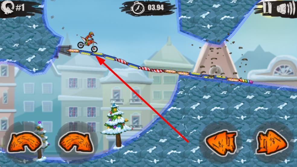 3、到了戰(zhàn)斗界面,操控摩托車借助屏幕下方的左右按鍵來調(diào)整車身平衡,小心地越過像糖果橋。