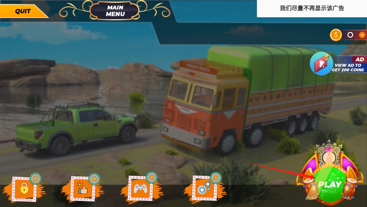 1、在游戲主菜單界面,跟隨箭頭提示,點擊PLAY,開啟卡車駕駛冒險,進入游戲世界,點擊開始游戲。