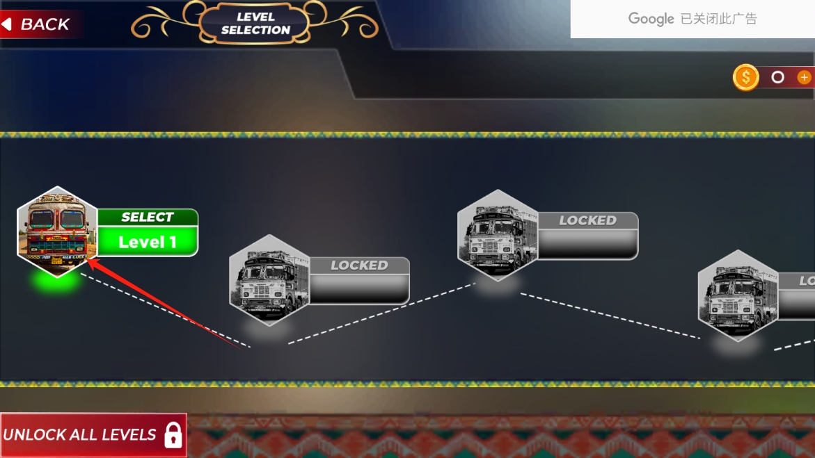 2、進入關(guān)卡選擇場景,根據(jù)箭頭提示,選擇第一關(guān),確定駕駛?cè)蝿?,為卡車駕駛挑戰(zhàn)做好準備,點擊選擇關(guān)卡。