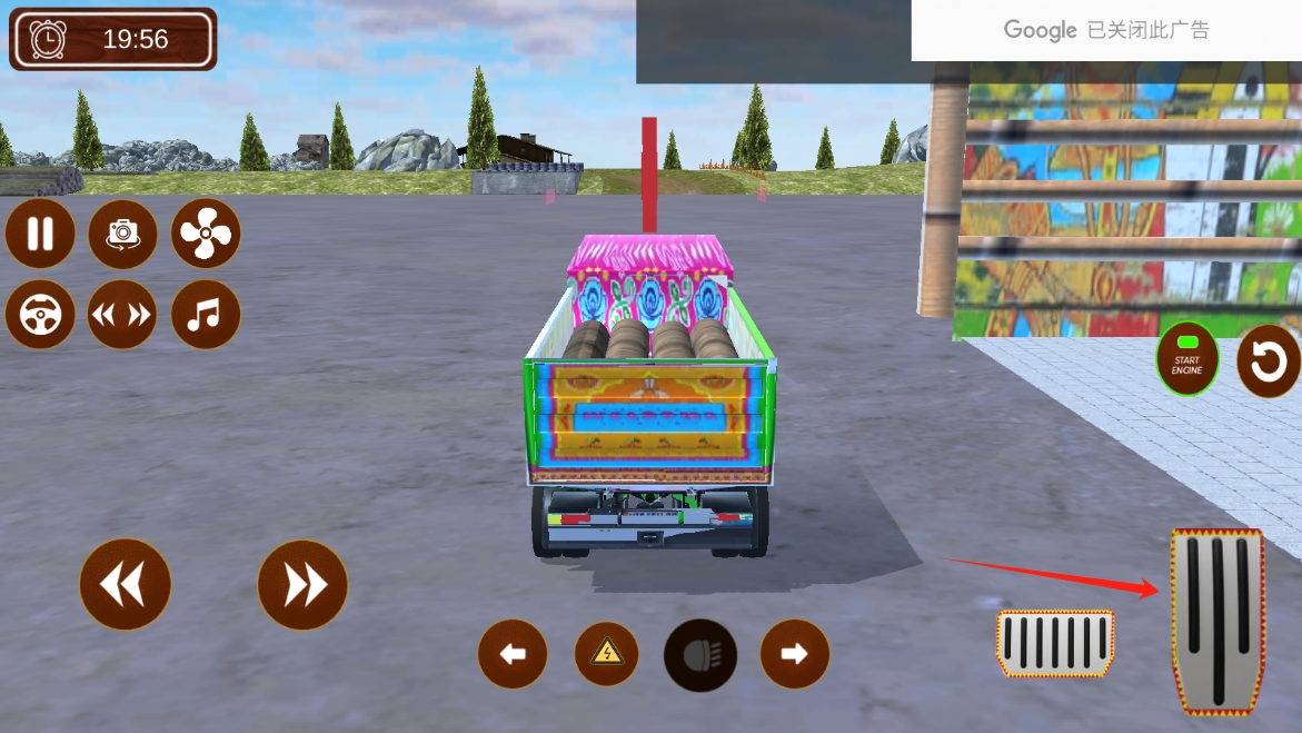 3、在駕駛操作場景中,根據(jù)箭頭提示,操控卡車,躲避障礙,運輸貨物,順利完成卡車駕駛?cè)蝿眨七M游戲進度,點擊加速。