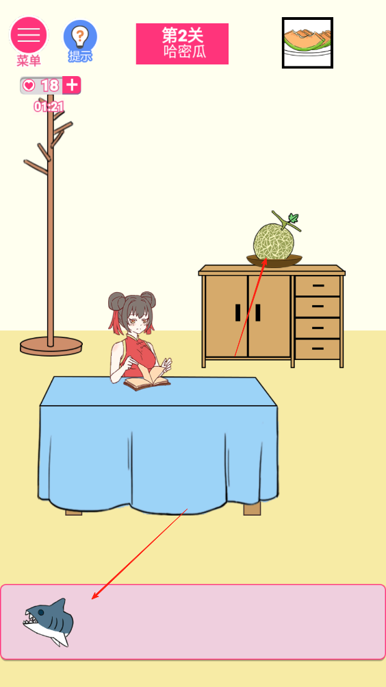 1、先拿起衣桿子上的鯊魚手套,將鯊魚手套拖到完整的哈密瓜上,這樣就可以將哈密瓜切開,再將哈密瓜拖到女友面前。