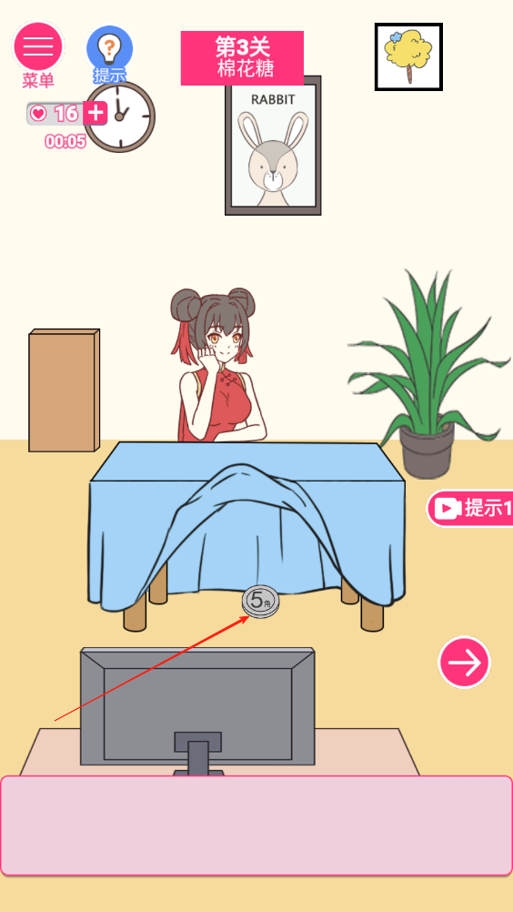 2、點擊箭頭找到棉花糖的攤子,攤子上寫著五角一個,回來后手指滑動桌布,找到桌布地下藏著的五角錢,再回到攤子即可購買棉花糖給女友。