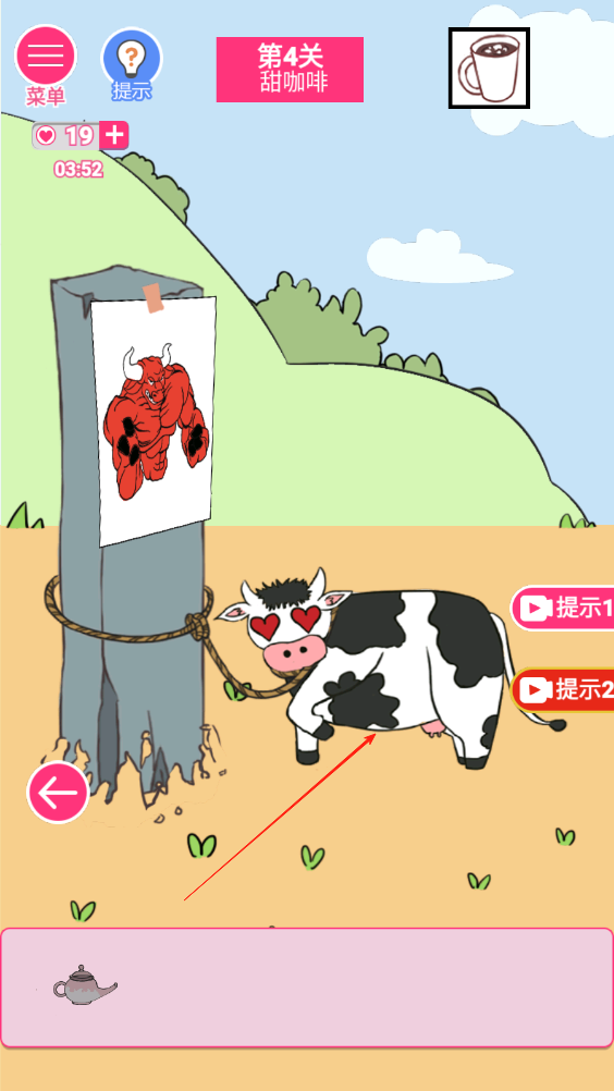 3、找到地毯底下的牛頭像,以及收集桌上的空茶壺,點擊箭頭到奶牛處,將牛頭像掛在石柱上,再將空茶壺拖到奶牛下邊,就可以拿到一壺牛奶,將牛奶放進(jìn)咖啡里即可。