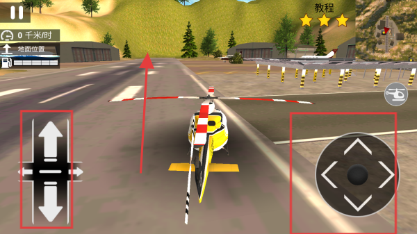 3、在直升機駕駛場景中,利用左側(cè)的方向控制按鈕和右側(cè)的操作按鈕,操控直升機在賽道上行駛,完成游戲任務(wù)。