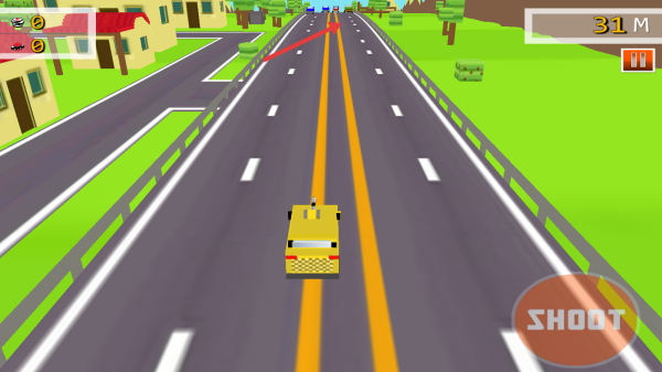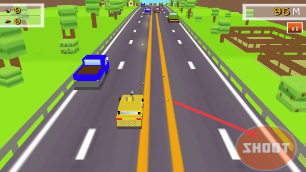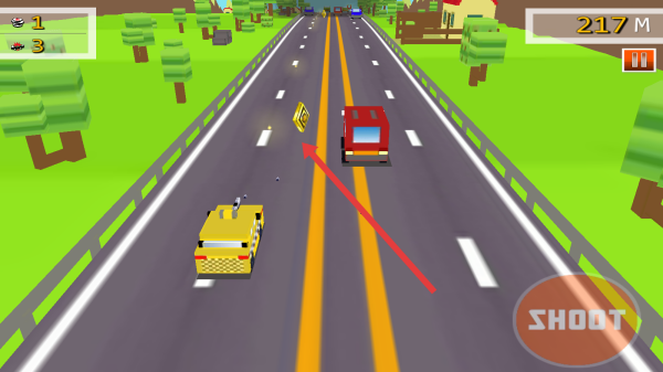 2、當(dāng)遇到前方有其他車(chē)輛阻礙時(shí),點(diǎn)擊SHOOT按鈕發(fā)射子彈,射擊前方車(chē)輛,為自己清理出安全的行駛道路。