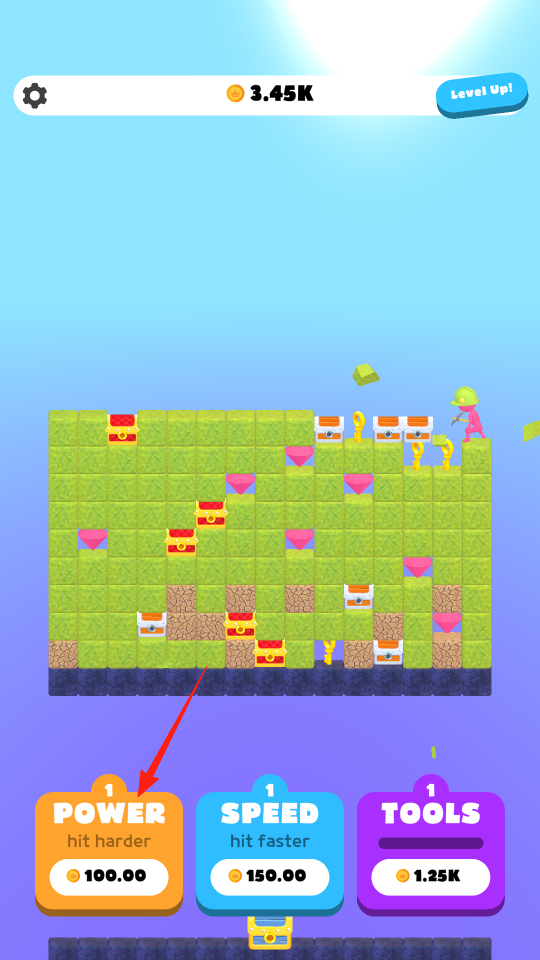 1、在打工人打工游戲界面,點(diǎn)擊POWER按鈕,消耗金幣提升攻擊力,通過強(qiáng)化力量屬性,讓角色挖礦更高效,打破堅(jiān)硬方塊,獲取更多寶藏,體驗(yàn)屬性升級(jí)機(jī)制。