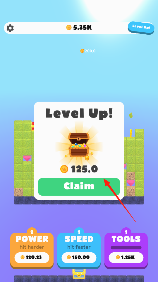 2、當(dāng)角色升級(jí)后,出現(xiàn)Level Up彈窗,點(diǎn)擊Claim,領(lǐng)取升級(jí)獎(jiǎng)勵(lì)金幣,利用獎(jiǎng)勵(lì),繼續(xù)強(qiáng)化屬性或解鎖工具,助力挖礦進(jìn)程,體驗(yàn)升級(jí)收益玩法。