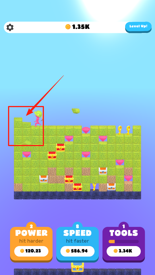 3、操控角色在綠色方塊地形移動(dòng),翻越障礙,尋找寶藏,通過規(guī)劃路線,避開難以挖掘的區(qū)域,優(yōu)先收集寶箱與鉆石,體驗(yàn)挖礦探索機(jī)制。