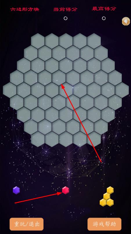 2、點(diǎn)擊并拖動(dòng)下方的方塊,放置到上方的六邊形網(wǎng)格區(qū)域中,當(dāng)在網(wǎng)格中形成一行或一列后相鄰的六邊形方塊時(shí),即可觸發(fā)消除。