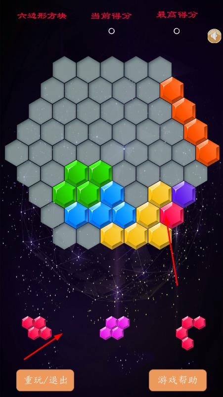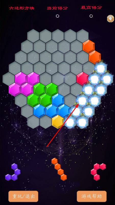 3、方塊消除后,上方的方塊會(huì)自動(dòng)下落填補(bǔ)空缺,繼續(xù)放置新的六邊形方塊,屏幕上方會(huì)實(shí)時(shí)顯示當(dāng)前得分和最高得分。