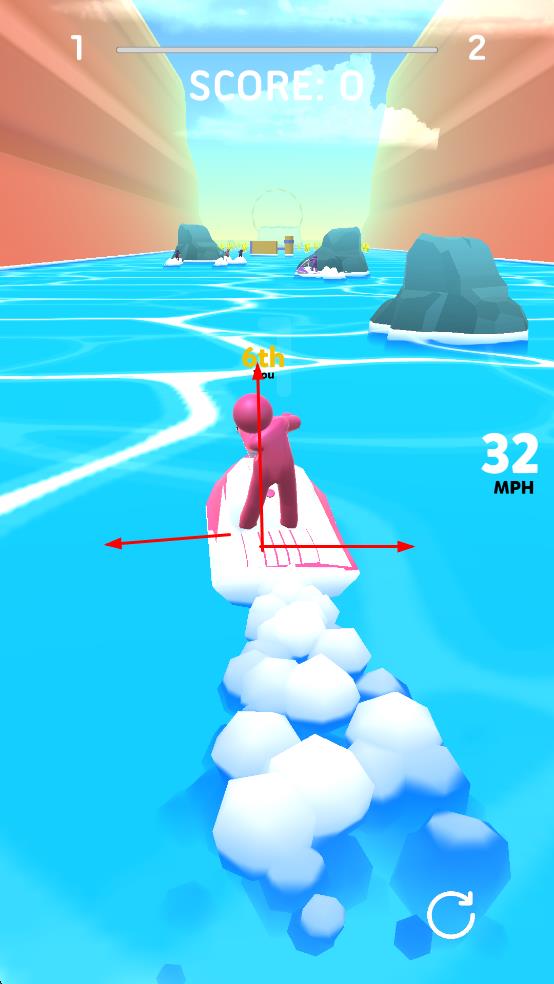 1、操控粉色小人角色駕駛水上摩托艇在藍色水面上移動,角色可前后左右移動。