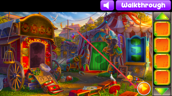 1、進入游戲界面后,觀察馬戲團場景,點擊各處物件探索,像帶動物頭像的車廂這是開啟解謎的第一步。