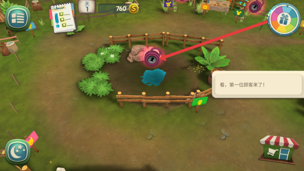 1、開啟動物旅館界面,看到第一位顧客來了的提示,查看初始的區(qū)域,完成基礎引導,這是開啟經(jīng)營的第一步。