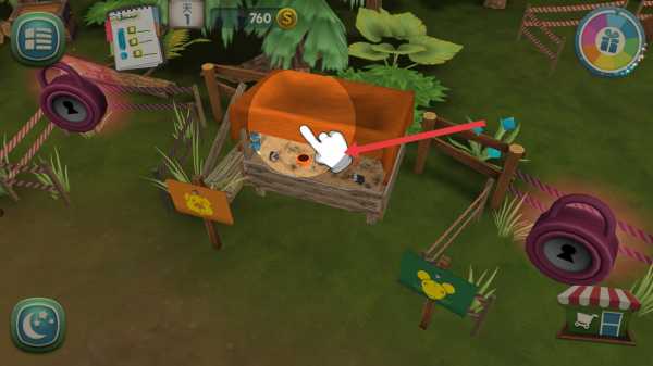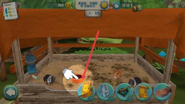 3、進入動物飼養(yǎng)區(qū)如豚鼠棚,按照提示用食物、水、清潔物品照顧動物,提升動物狀態(tài),一起滿足經(jīng)營要求。