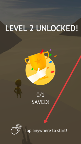 3、Level-2解鎖后,界面顯示0/1SAVED,根據(jù)箭頭提示點(diǎn)擊屏幕任意位置,開始第二關(guān)的挑戰(zhàn)任務(wù)。