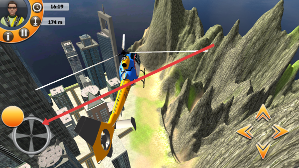 3、進(jìn)入關(guān)卡后,操控直升機(jī),利用左側(cè)操控盤(pán)和右側(cè)方向鍵,然直升機(jī)在城市與山脈環(huán)境中飛行。