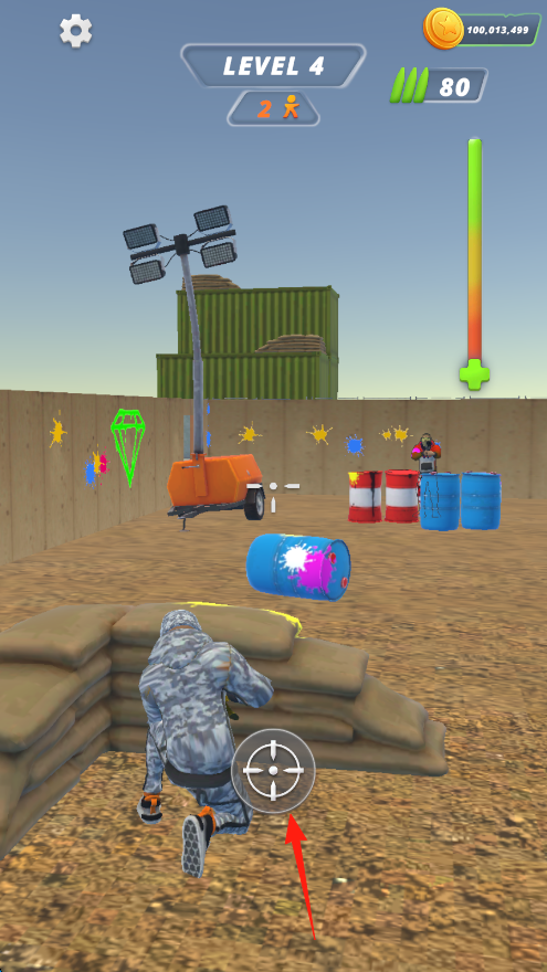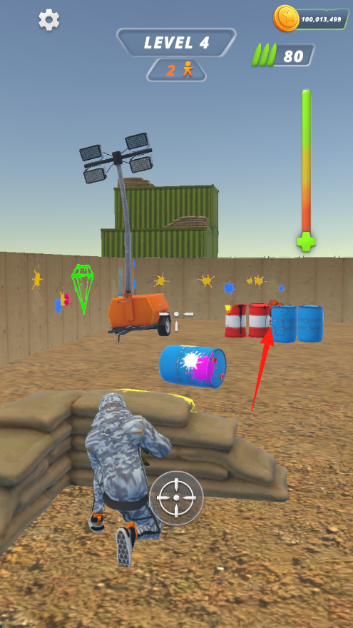 1、在LEVEL4場(chǎng)景,操控迷彩角色,按箭頭指引,移動(dòng)到沙袋掩體后,瞄準(zhǔn)紅藍(lán)桶區(qū)域。