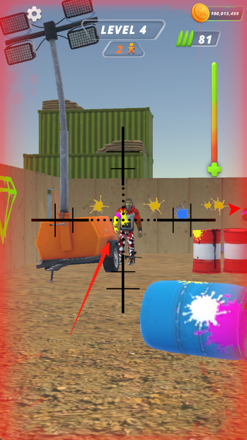 2、點(diǎn)擊屏幕瞄準(zhǔn)鍵,鎖定從桶后出現(xiàn)的敵人,利用彩彈槍射擊,注意躲避敵人反擊,優(yōu)先攻擊箭頭標(biāo)記目標(biāo)。