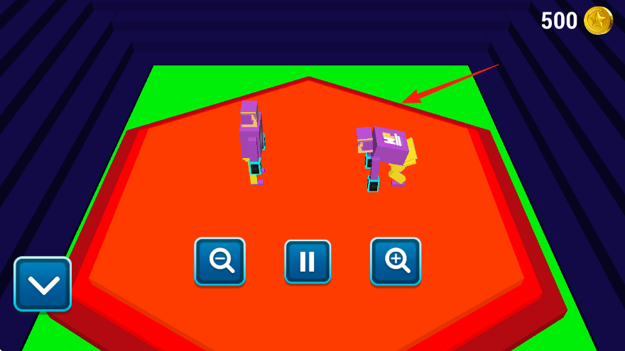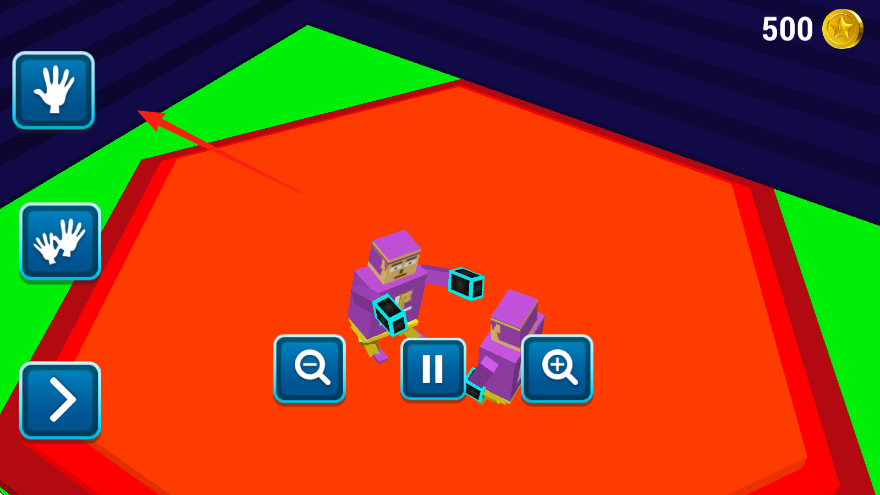 1、進入1v1競技場,操控紫色方塊人,按箭頭指引,靠近對手,點擊左側(cè)單手掌按鈕,發(fā)動攻擊。