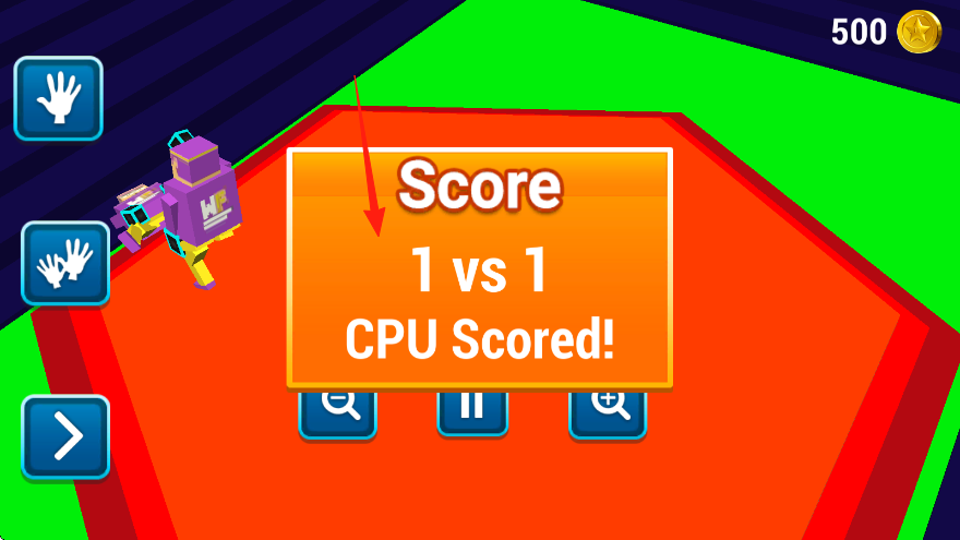 3、若被CPU擊敗,界面顯示Score1vs1CPUScored!,點擊>按鈕,重新開始,調(diào)整策略,擊敗對手,贏得勝利。